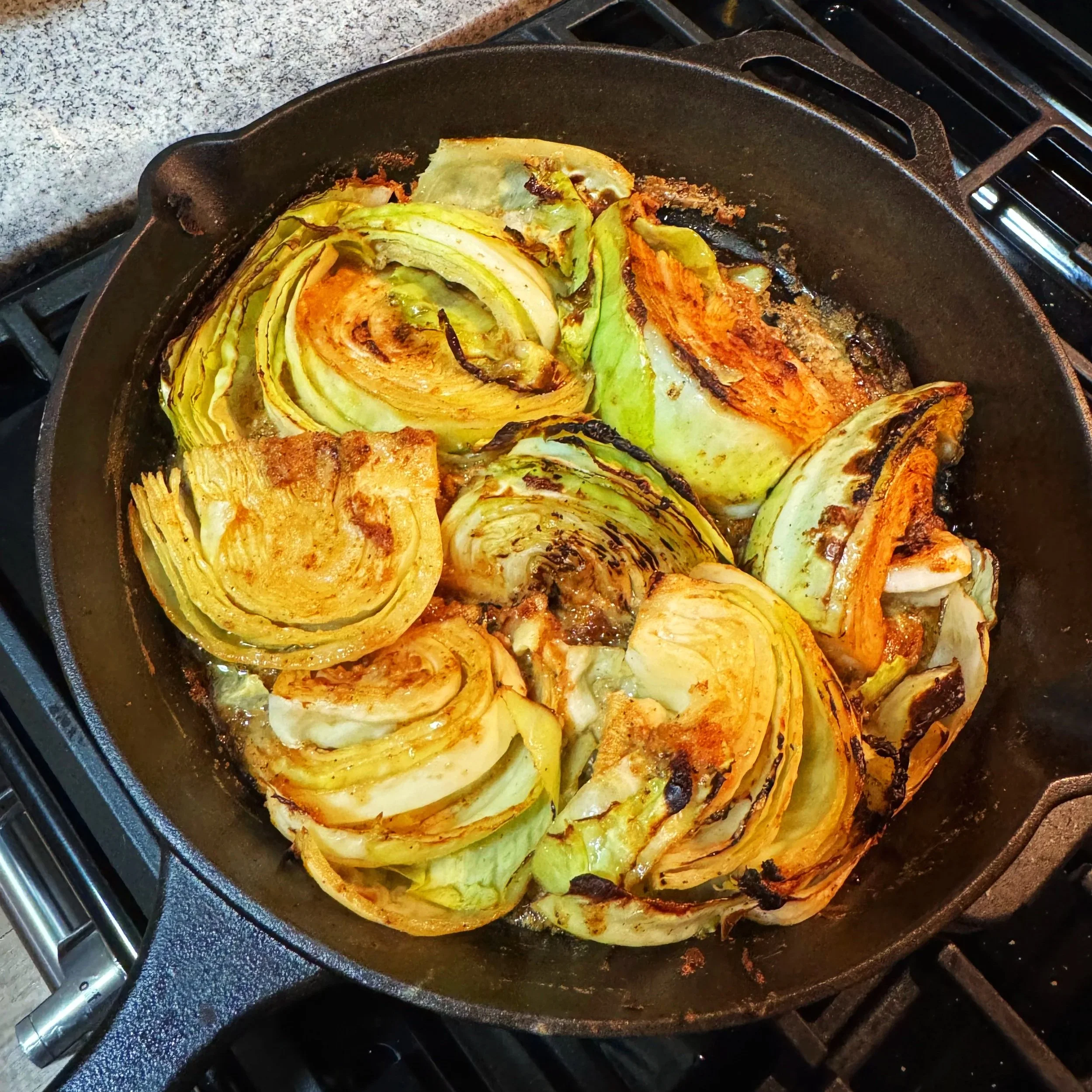 Sear cabbage for 5 minutes on each side - season with salt, pepper, onion powder, garlic powder and creole seasoning if using